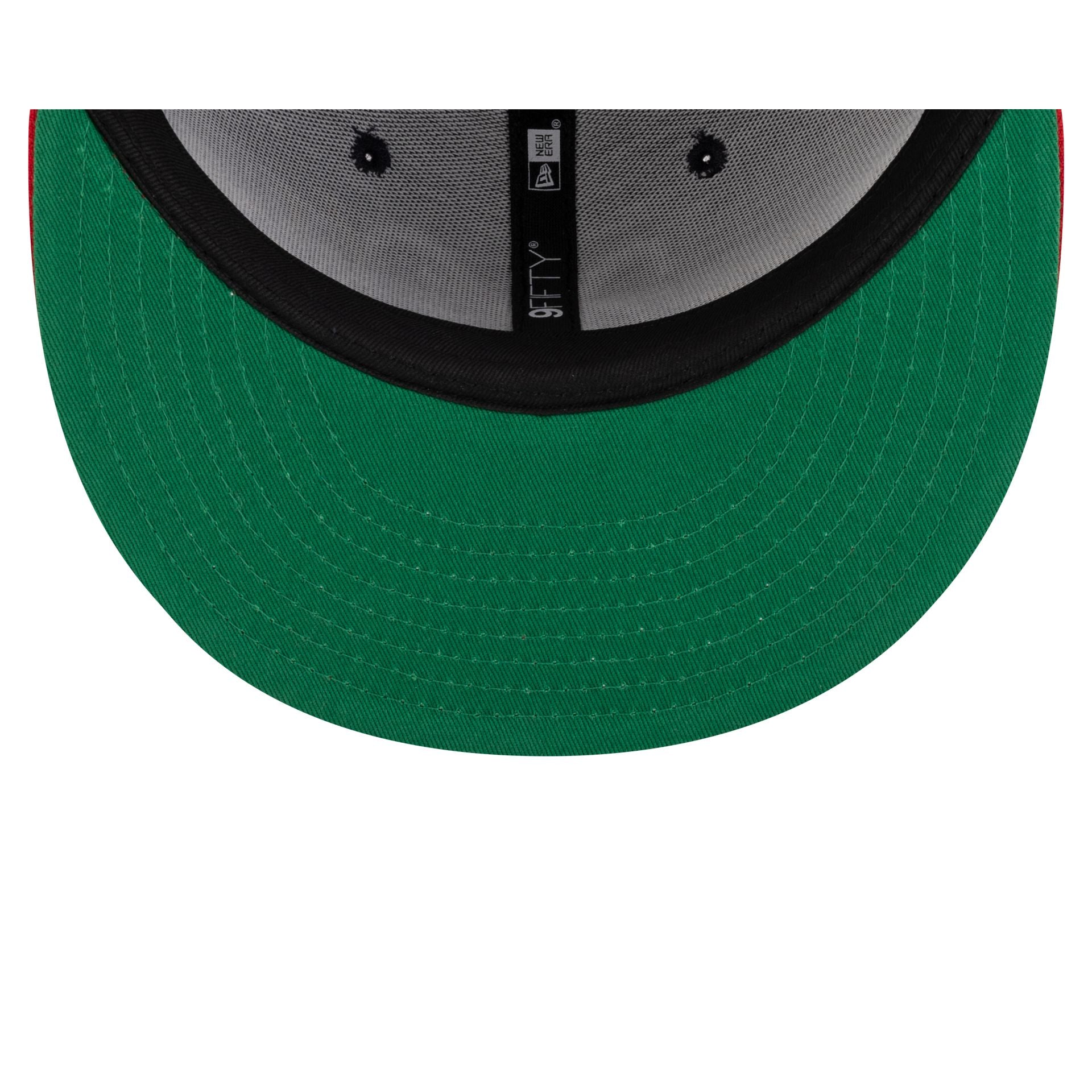 The Usher x Atlanta Braves 9FIFTY Snapback features an embroidered upside down Braves logo and a Peace Up. A-Town Down graphic at the front panels. Additional details include a snapback closure at the rear and a green undervisor.