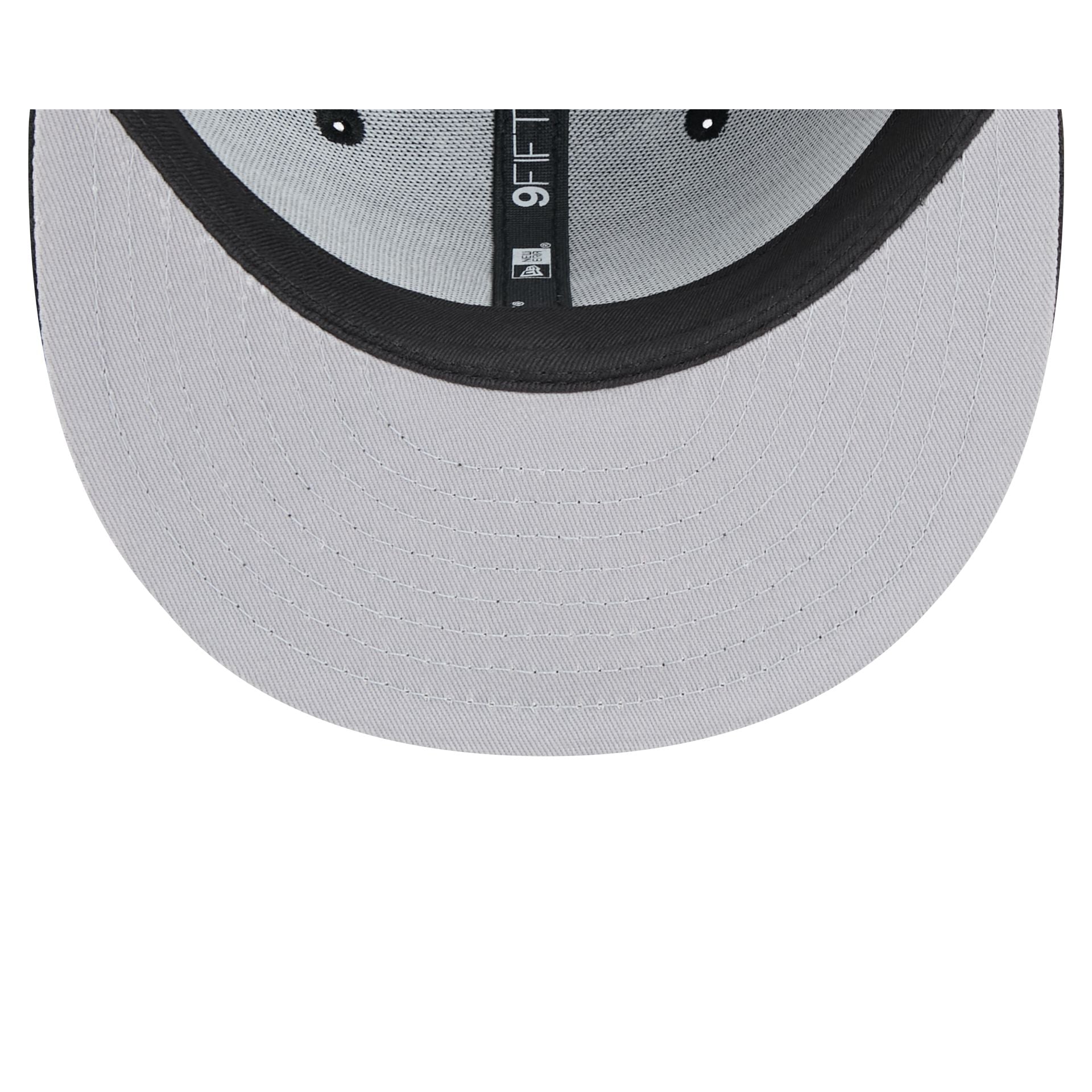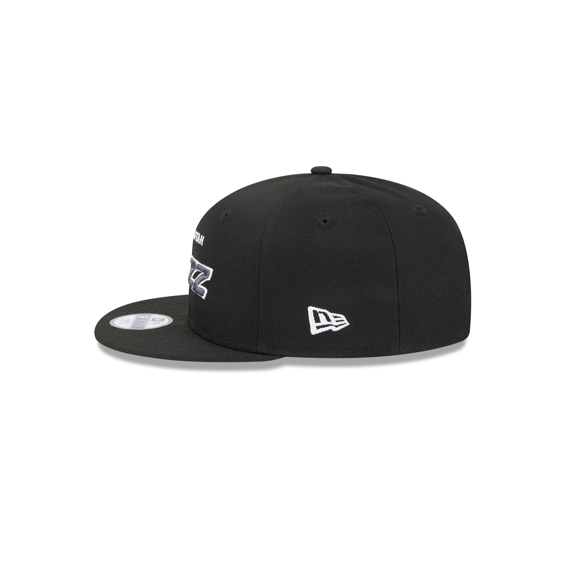 The Utah Jazz Kids 9FIFTY Snapback Hat features an embroidered Jazz wordmark at the front panels with a matching team logo at the right-wear side. Additional details include a gray undervisor and a snapback closure at the rear.