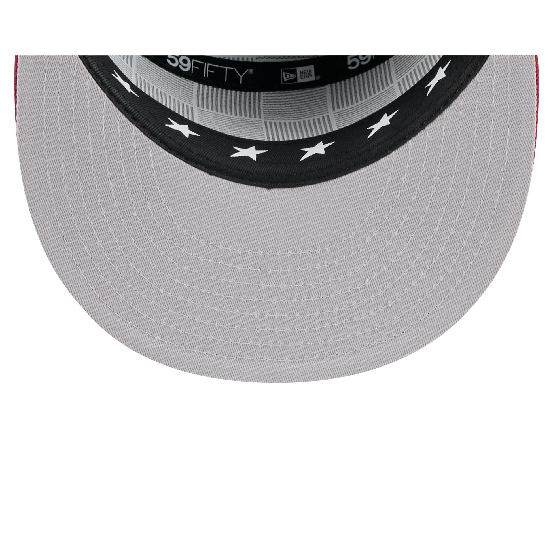 The Arizona Diamondbacks 2025 All-Star Game Split Panel 59FIFTY Fitted Cap features an embroidered Diamondbacks logo at the front panels against a split-crown construction with breathable mesh fabric at the side and rear panels. Additional details include stars at the top panel. a 2025 All-Star Game patch at the right-wear side. the MLB Batterman logo at the rear. and a gray undervisor. The cap also features screen-printed stars on the sweatband.