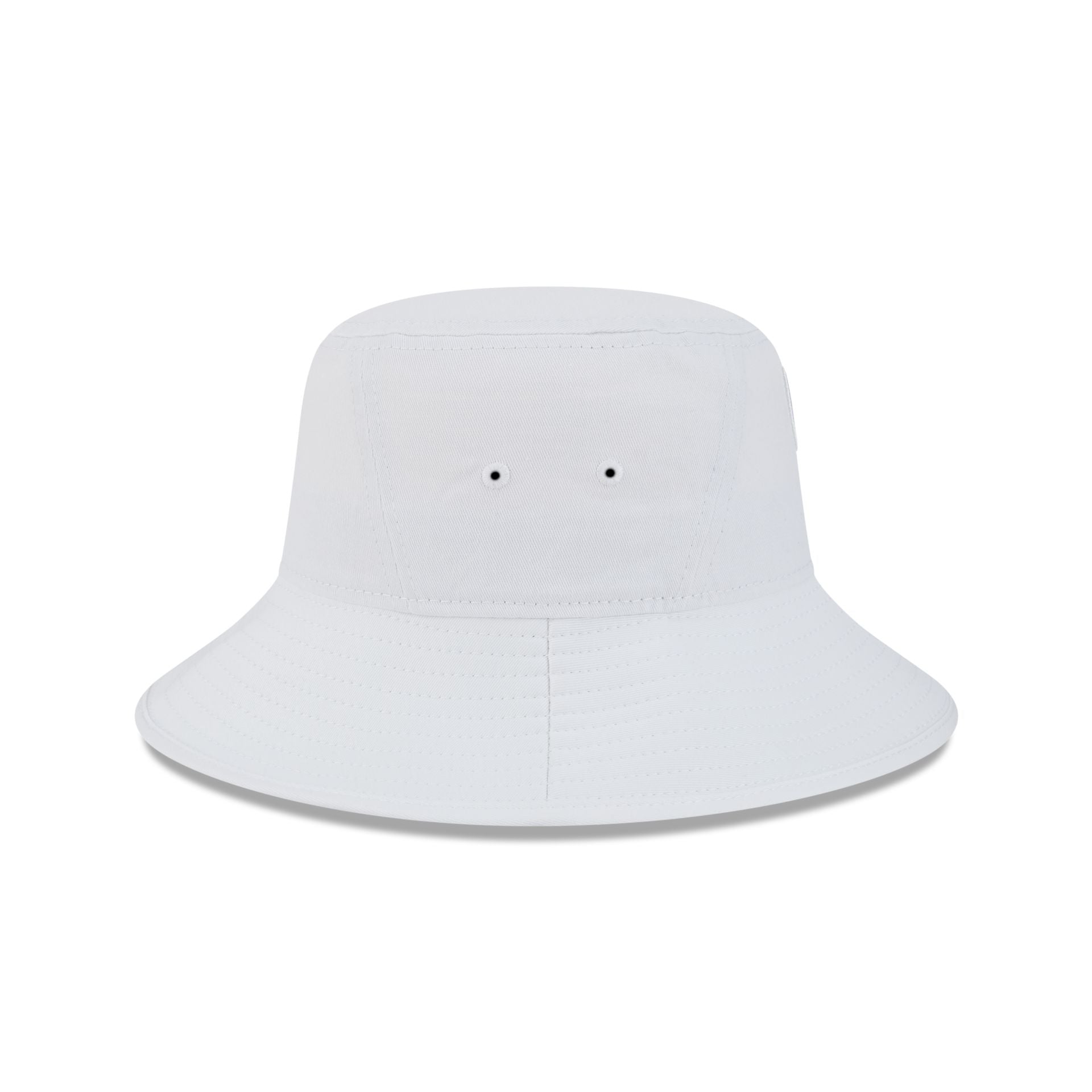 The Atlanta Dream Optic White Bucket Hat features an embroidered Dream logo at the front with a matching New Era Flag at the left-wear side.