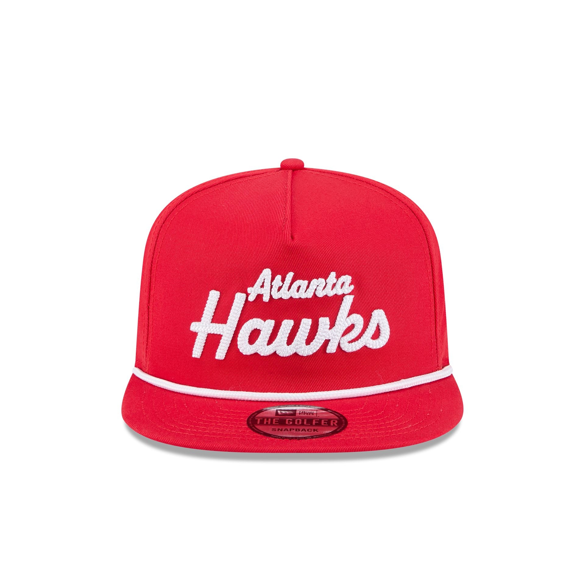 The Atlanta Hawks Team Text Golfer features an embroidered Hawks script at the front panels with a team logo at the right-wear side and a snapback closure at the rear.