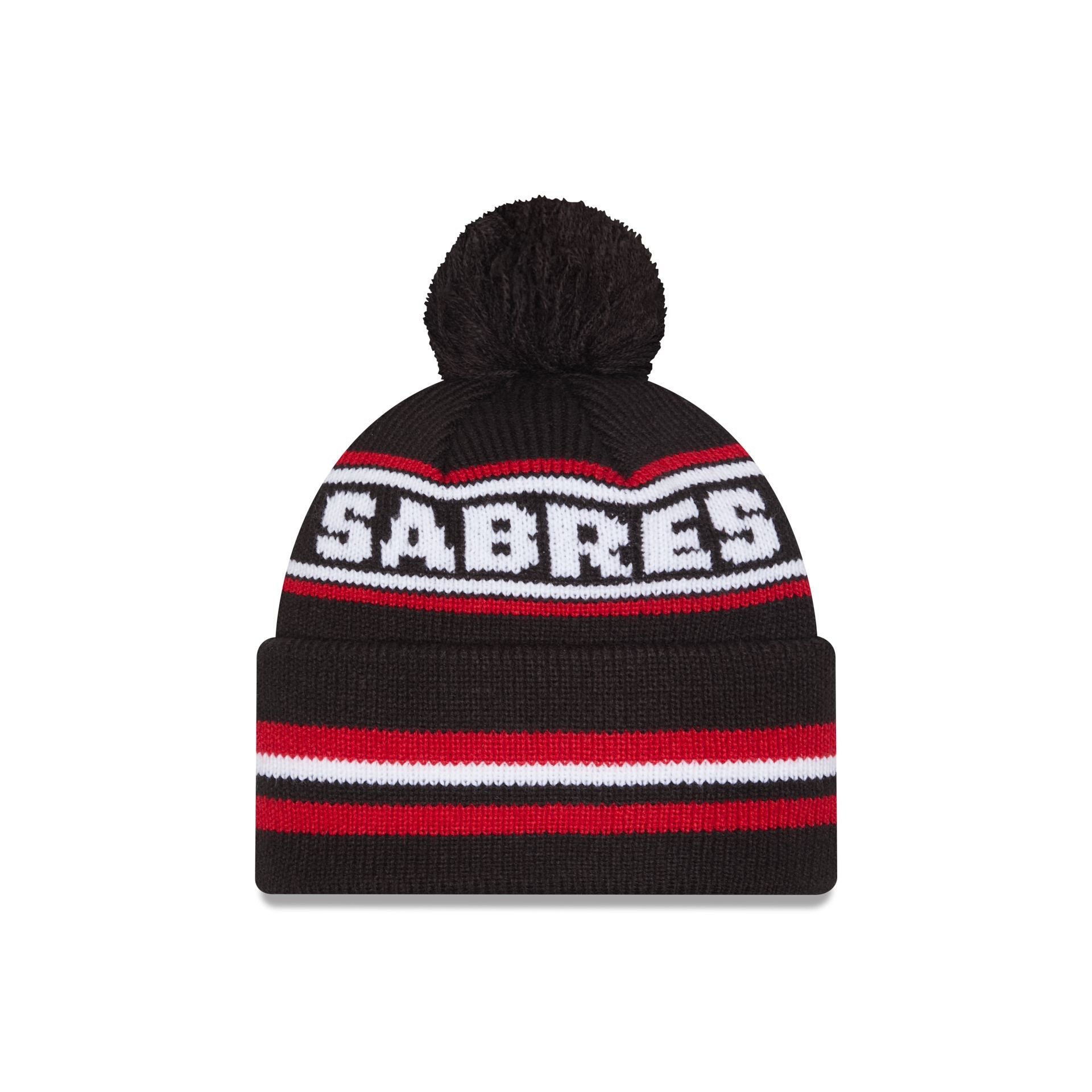 The Buffalo Sabres Alternate Classic Pom Knit Hat features an embroidered Sabres alternate logo at the front cuff with a wordmark at the crown and a one-time removable pom.