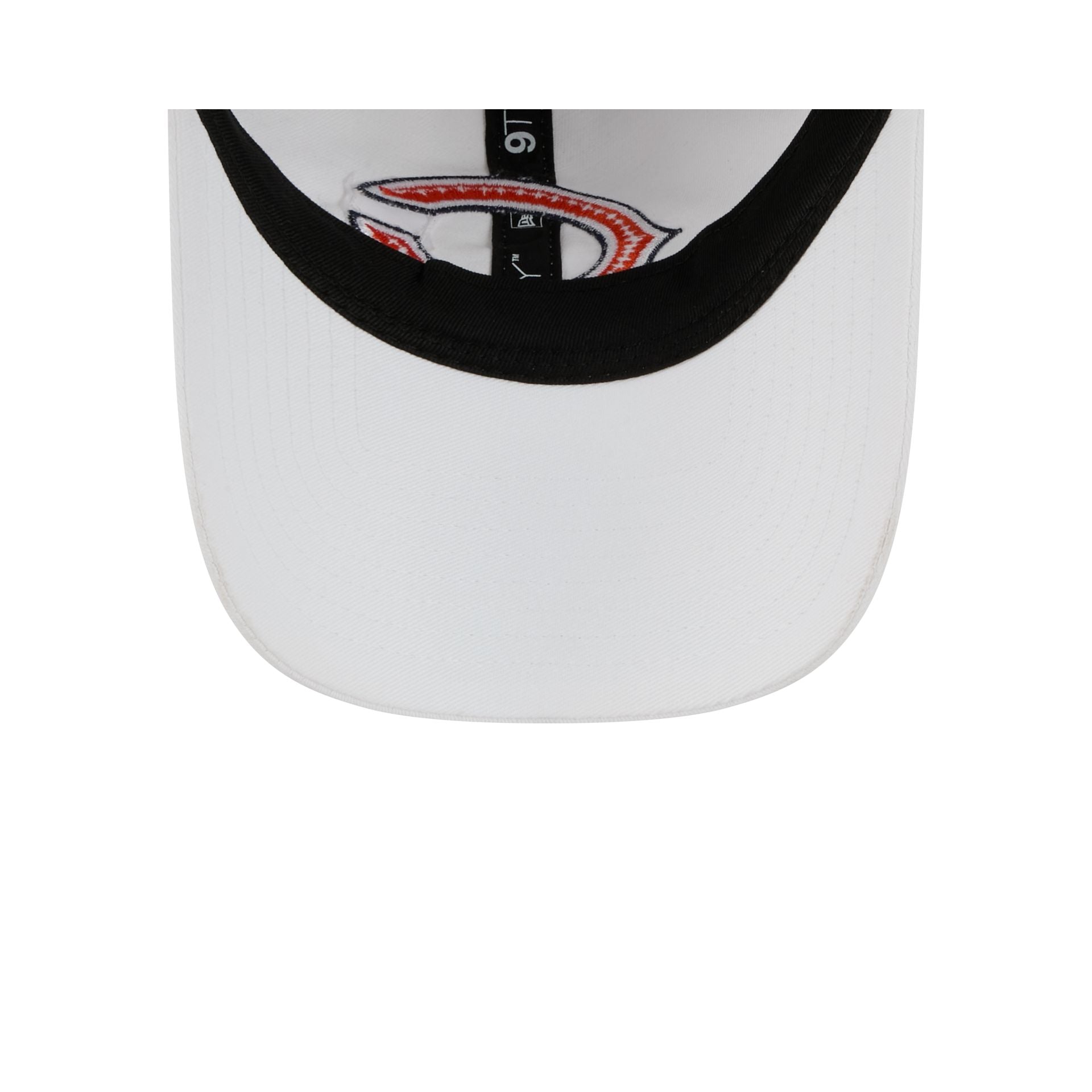 The Chicago Bears White 9TWENTY Adjustable Cap features an embroidered Bears logo at the front panel with a matching woven team logo tag at an adjustable D-Ring closure at the rear.