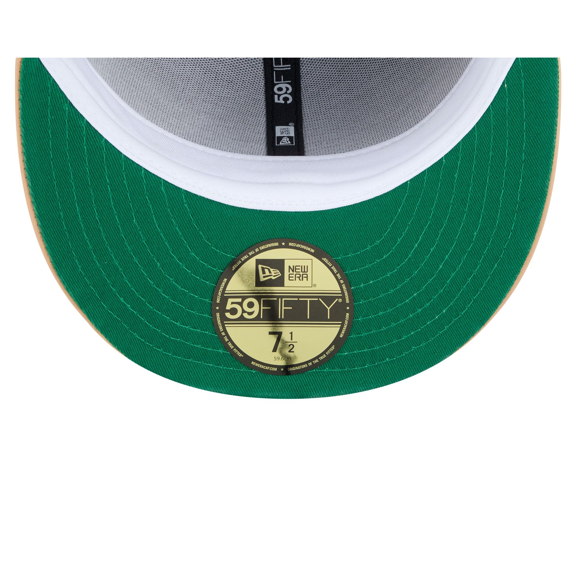 The Chicago Blackhawks Leather Visor 59FIFTY Fitted Cap features an embroidered Blackhawks logo at the front panels with a cream leather visor. Additional details include an NHL Shield logo at the rear and a green undervisor with leather accents throughout.