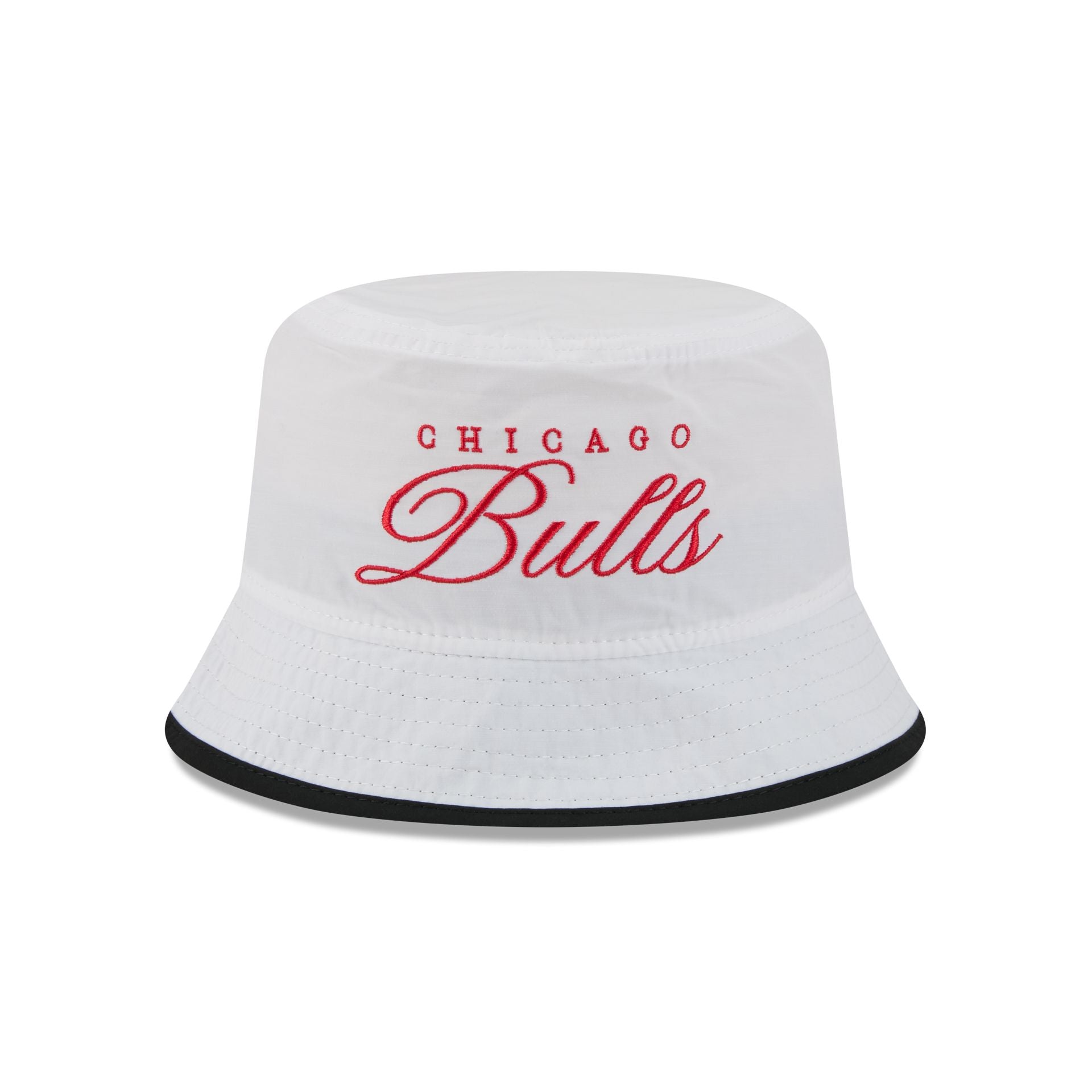 The Chicago Bulls 2025 Draft Bucket Hat features an embroidered Bulls script wordmark at the front with a team logo at the right-wear side. Additional details include a silicone NBA Logoman on a woven tag at the rear.