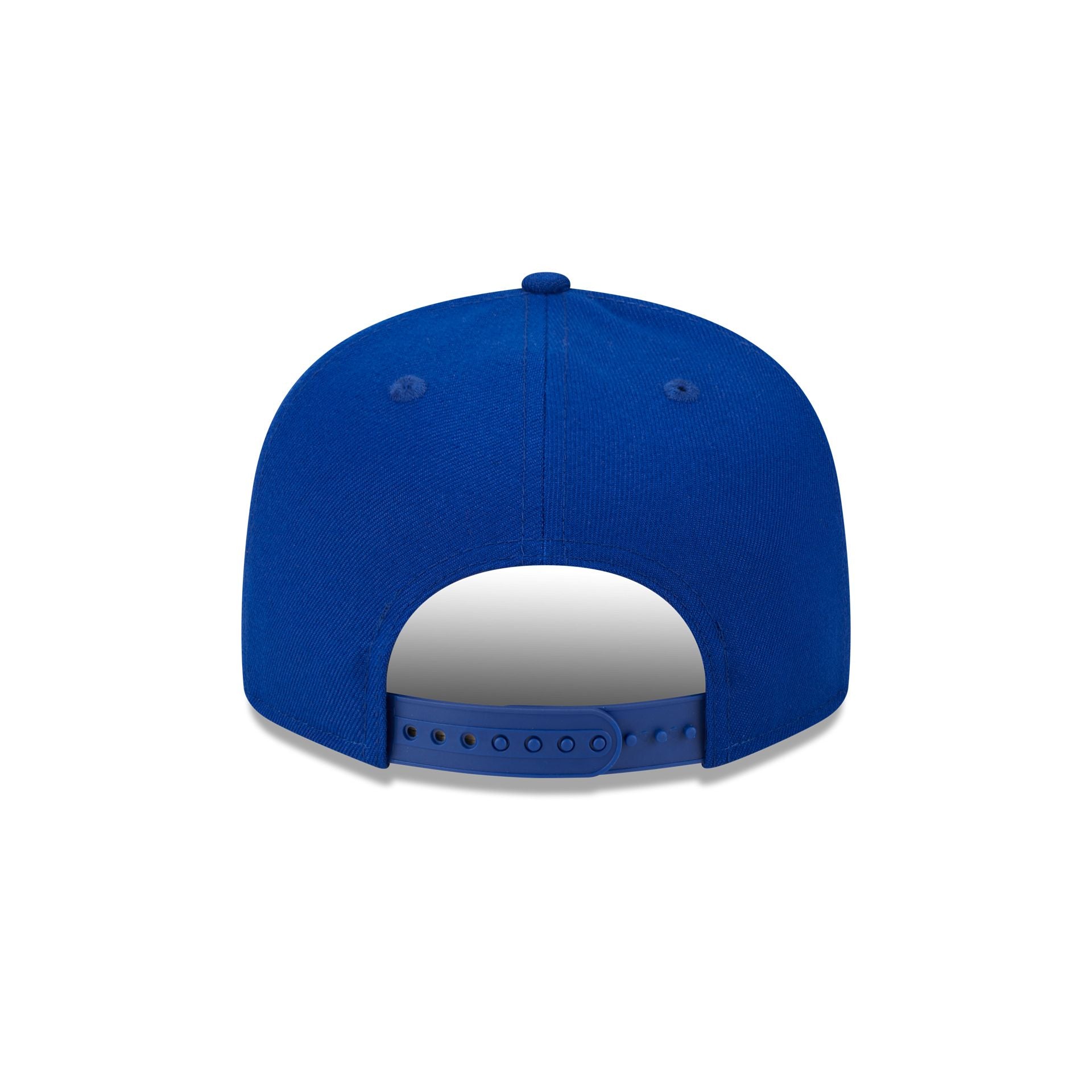 The Chicago Cubs 2025 Batting Practice 9FIFTY Snapback features an embroidered Cubs logo at the front panels with a matching snapback closure at the rear. Additional details include a pivot knit fabrication. a blue visor. and a gray undervisor.