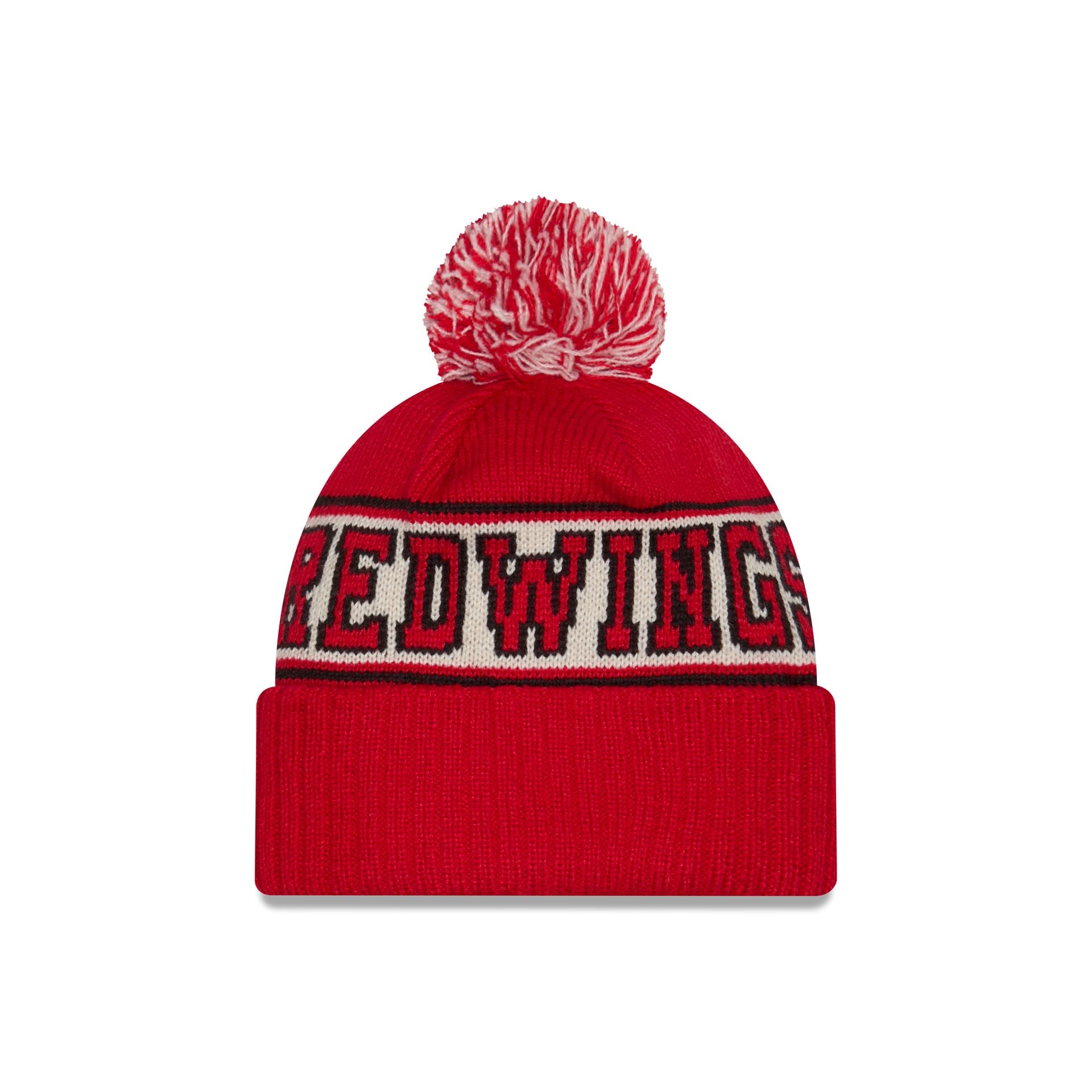 The Detroit Red Wings Retro Pom Knit Hat features an embroidered Red Wings logo at the front cuff with a team wordmark at the crown and a one-time removable pom.