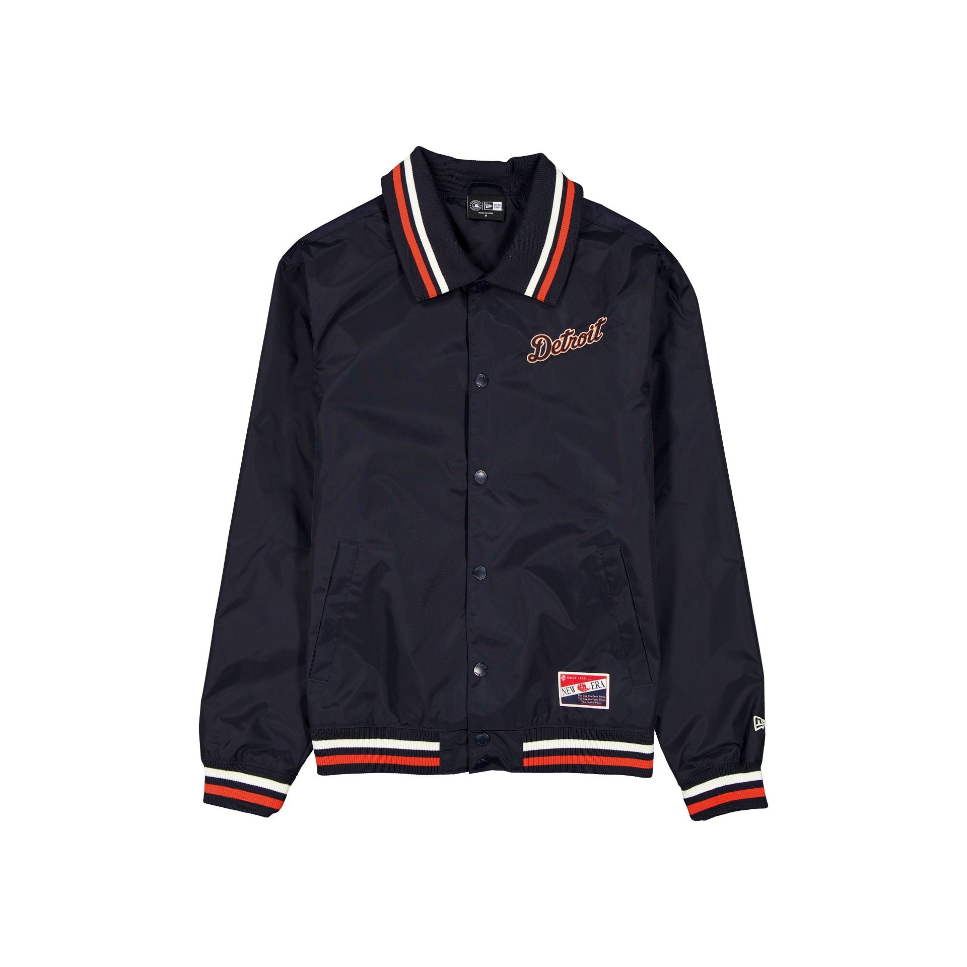 The Detroit Tigers Throwback Jacket features an embroidered Tigers logo at the left chest with a logo and wordmark at the rear. Additional details include pockets. a button closure. and a New Era jock tag at the left hip.