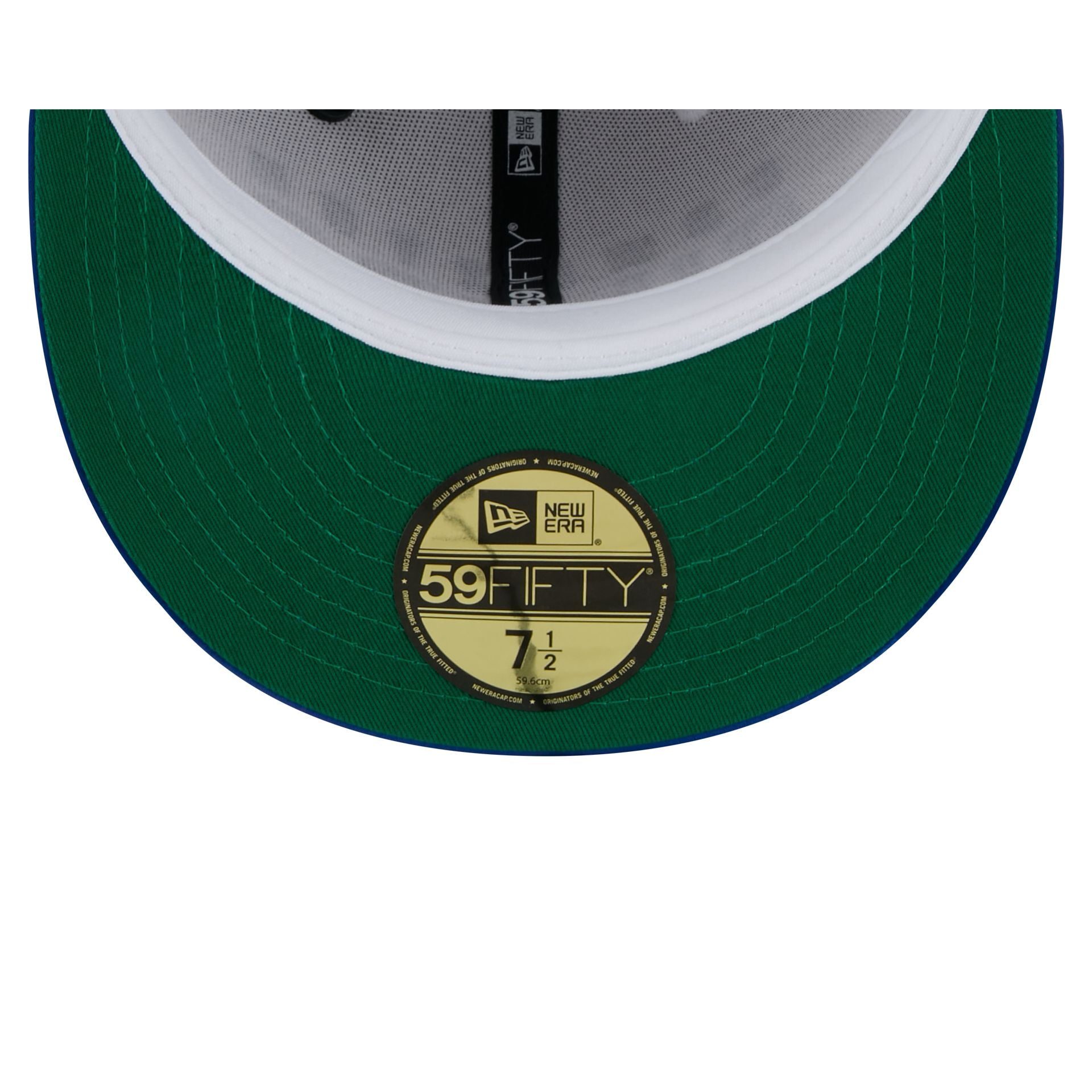 The Edmonton Oilers Spring Satin 59FIFTY Fitted Cap features an embroidered Oilers wordmark at the front panels with a New Era pin at the top left panel and an NHL Shield logo at the rear. Additional details include a satin fabrication throughout. a logo at the right-wear side. and a green undervisor.