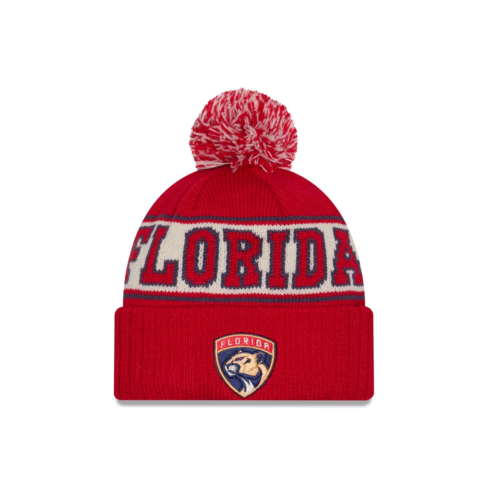 The Florida Panthers Retro Pom Knit Hat features an embroidered Panthers logo at the front cuff with a team wordmark at the crown and a one-time removable pom.