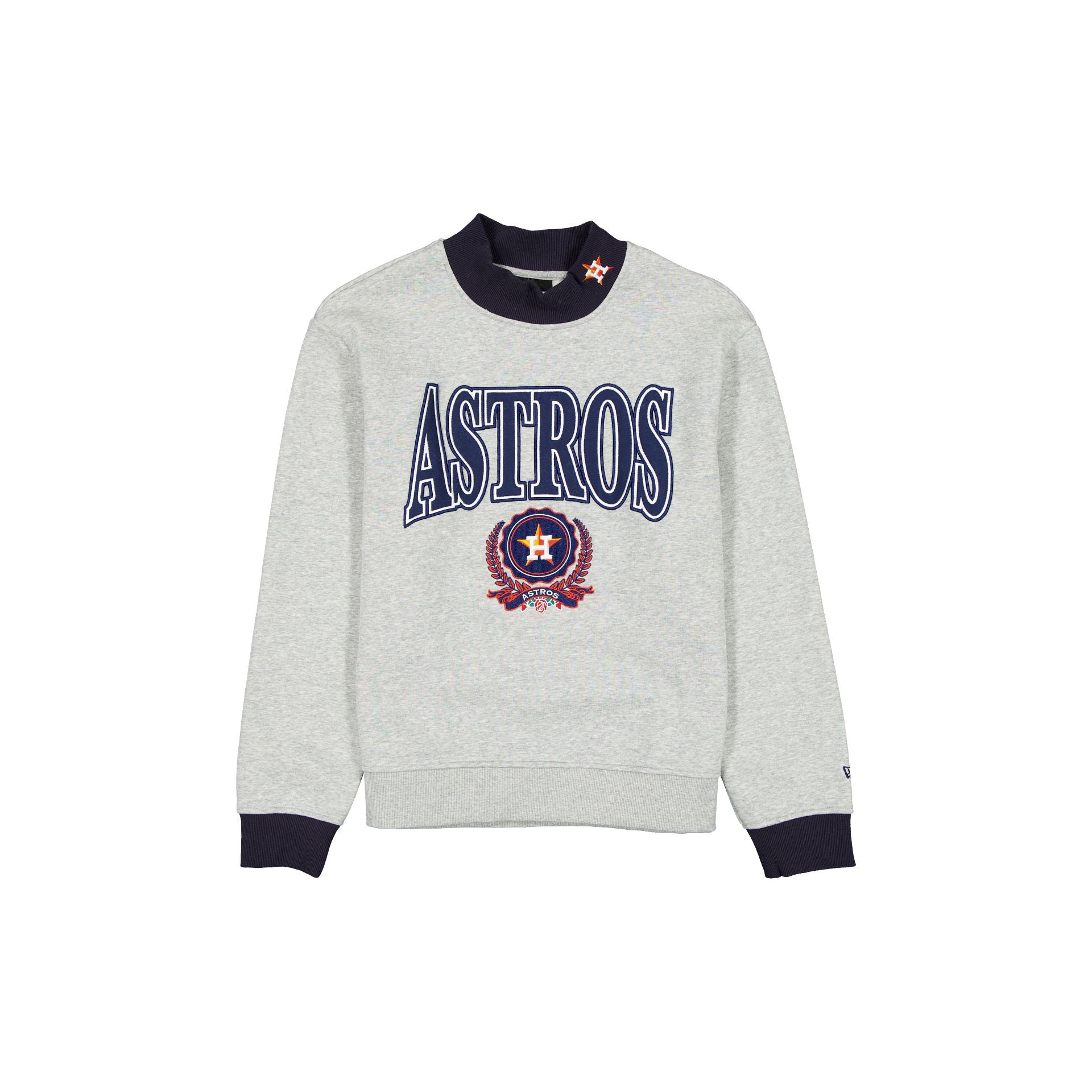 The Houston Astros Throwback Prep Women’s Mockneck Sweatshirt features an embroidered Astros wordmark above a team emblem at the front with a matching logo at the neckline.