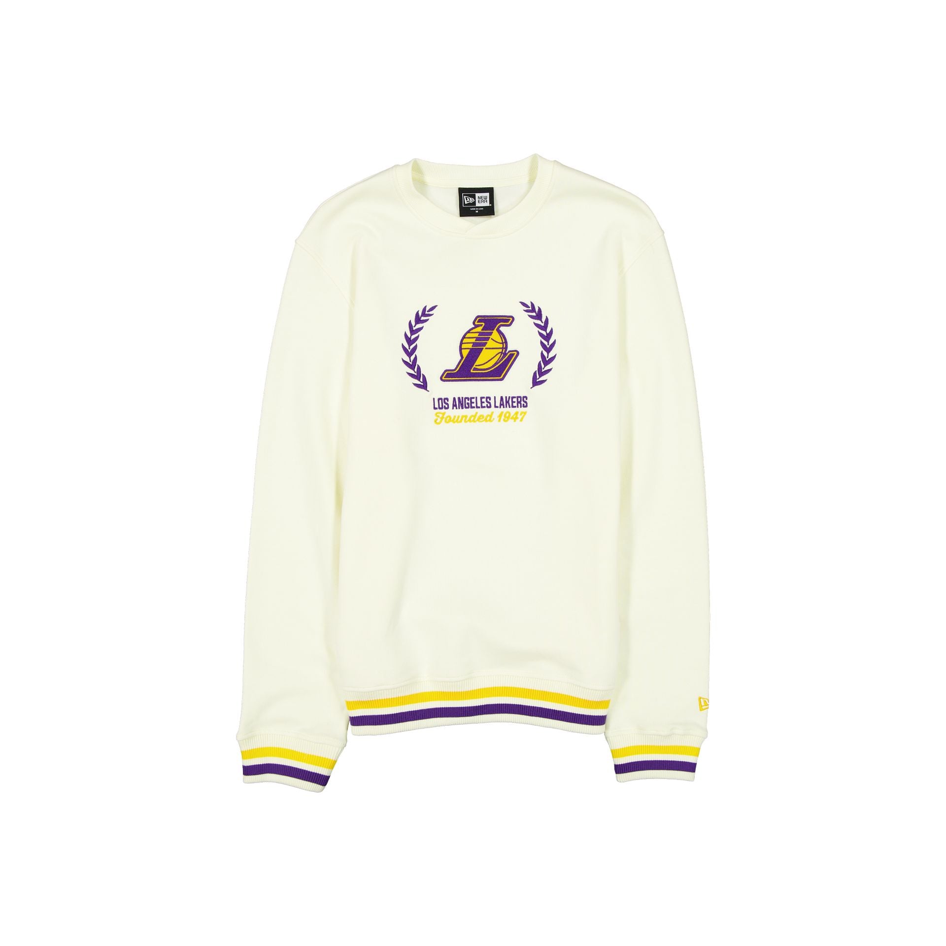 The Los Angeles Lakers Throwback Chrome White Crewneck features a twill applique Lakers logo and an embroidered wordmark at the front with a New Era jock tag at the left hip.
