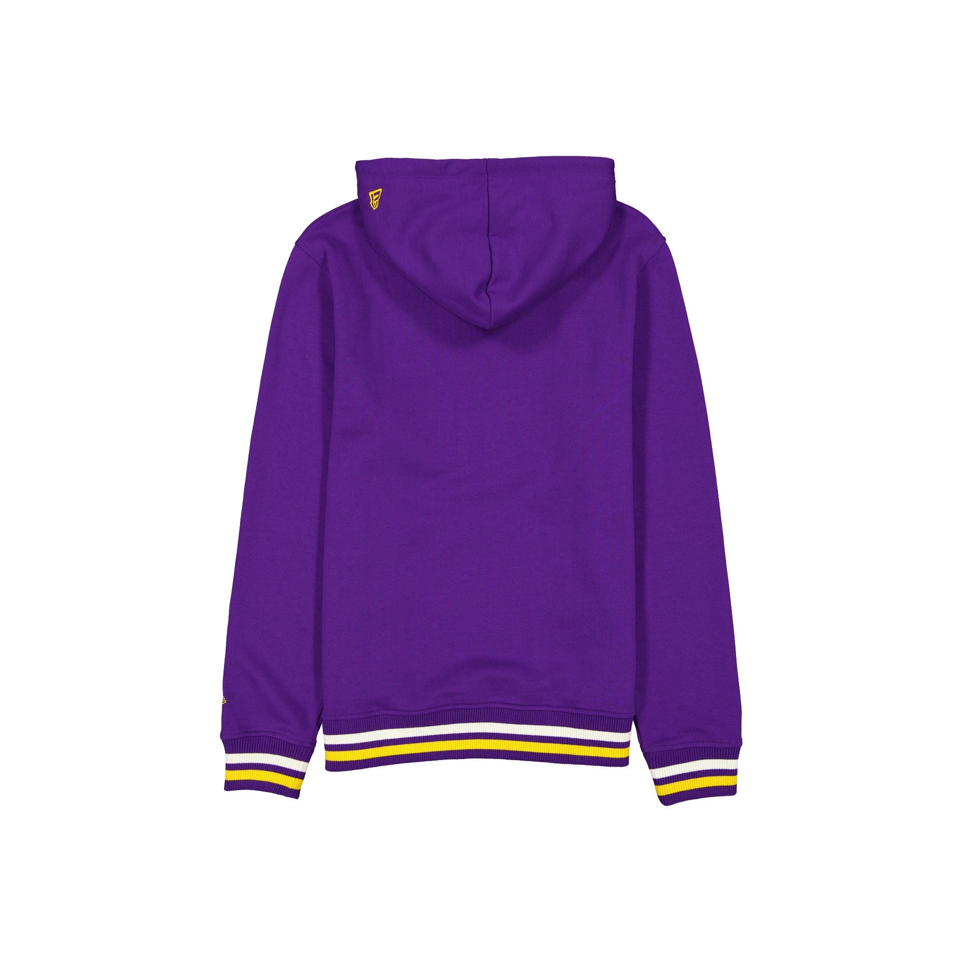 The Los Angeles Lakers Throwback Hoodie features a felt applique Lakers wordmark at the front with kangaroo pockets. adjustable drawstrings at the hood. and a New Era jock tag at the left pocket.