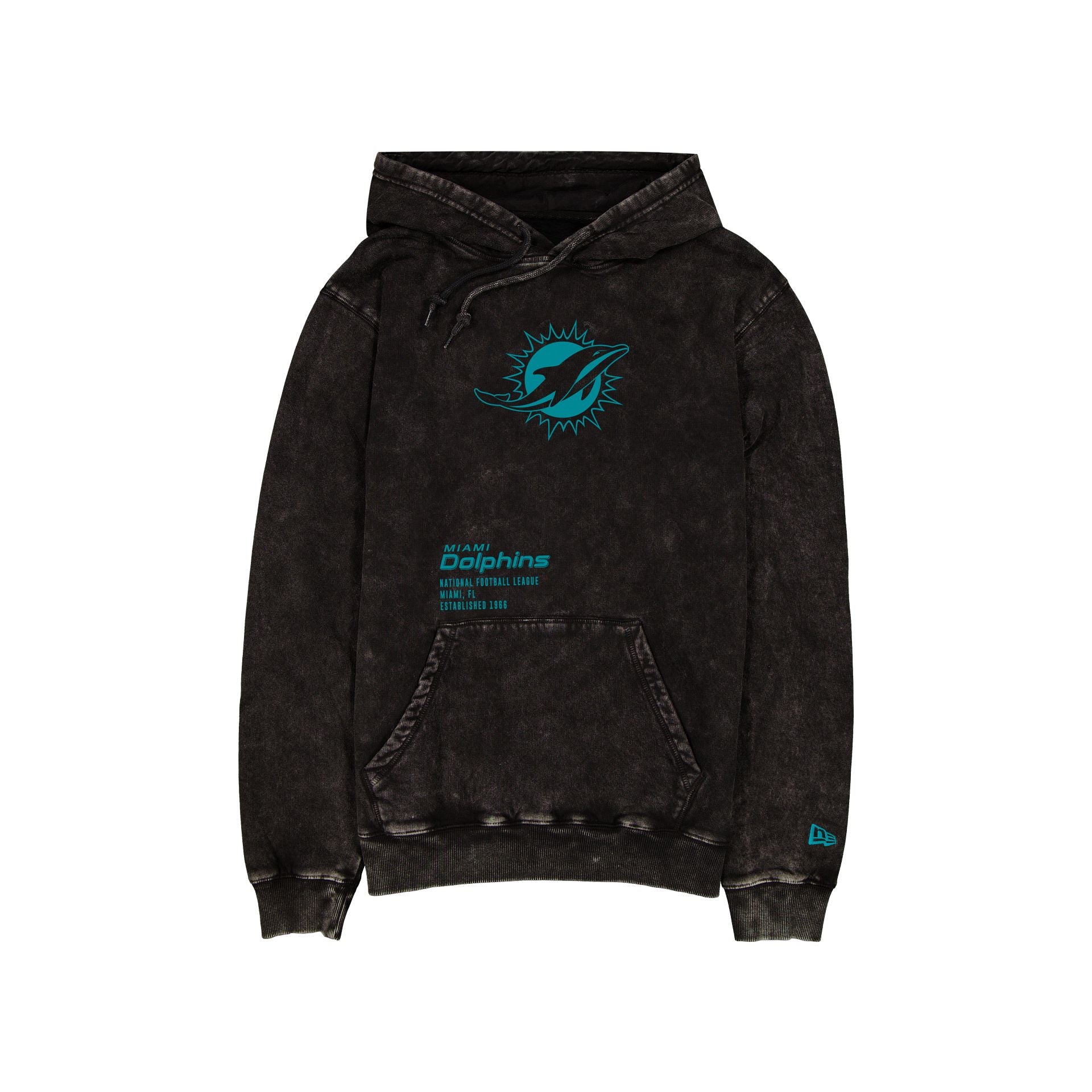 The Miami Dolphins Sport Night Black Hoodie features a screen-printed Dolphins graphic at the front with kangaroo pockets and adjustable drawstrings at the hood.