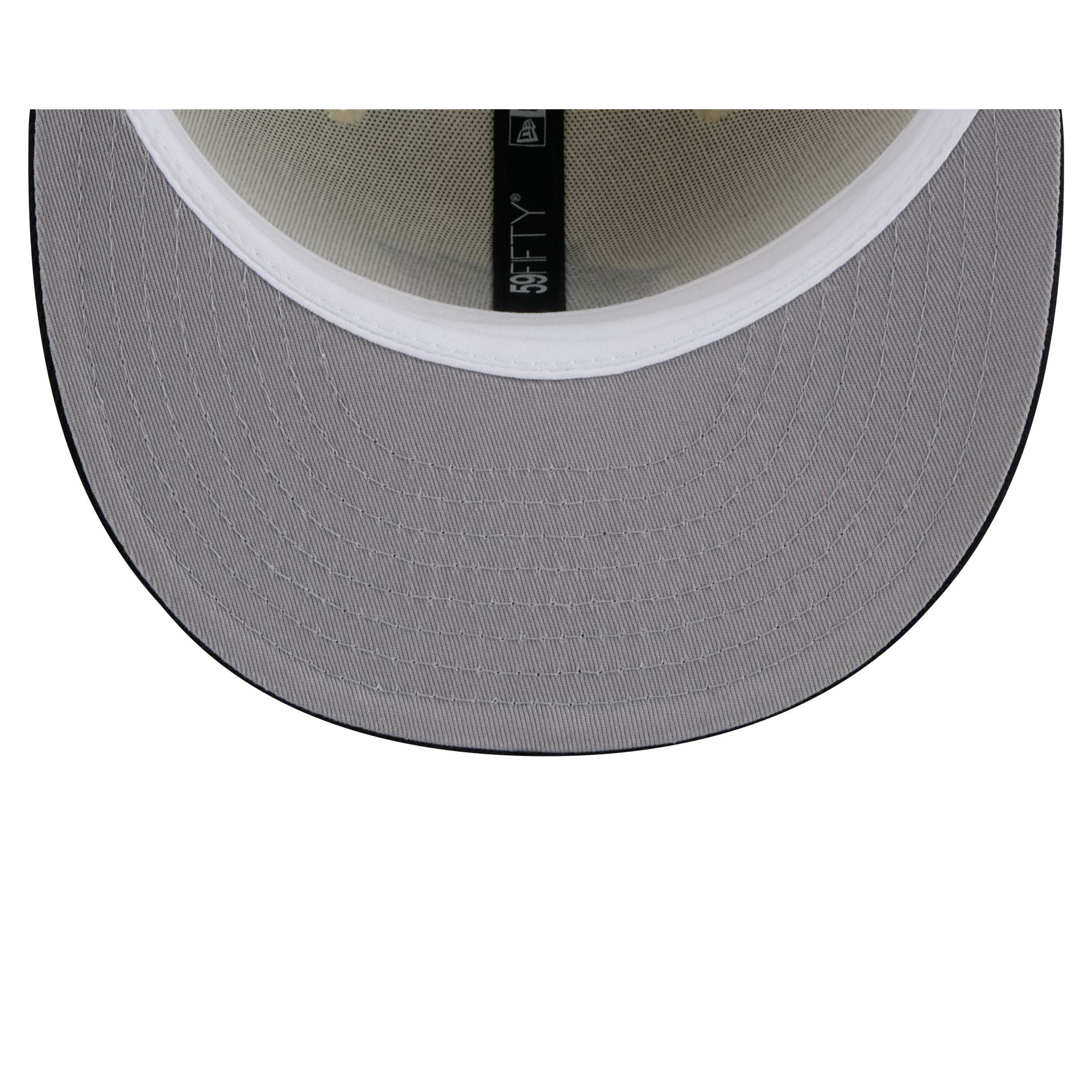 The Miami Marlins Chrome 59FIFTY Fitted Cap features an embroidered Marlins logo at the front panels with a matching MLB Batterman logo at the rear. a black visor. and a gray undervisor.