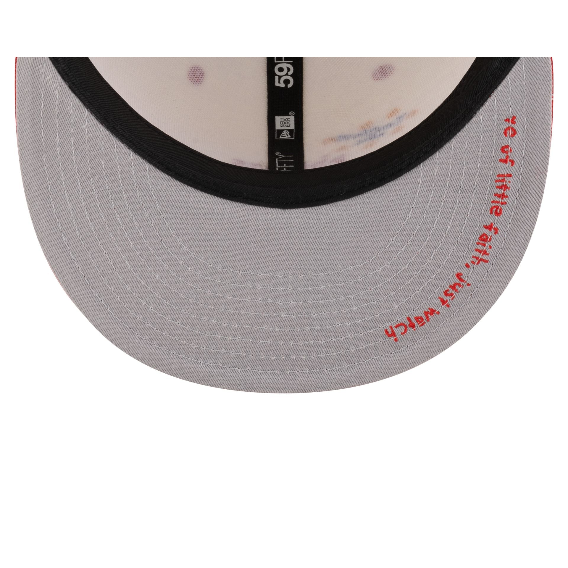 The Micah Johnson x Philadelphia Phillies 59FIFTY Fitted Cap features an embroidered Phillies wordmark and city artwork at the front panels with a matching MLB Batterman logo at the rear. Additional details include a AKU astronaut helmet embroidered at the right-wear side with a team color visor and a ye of little faith. just watch quote at the gray undervisor.