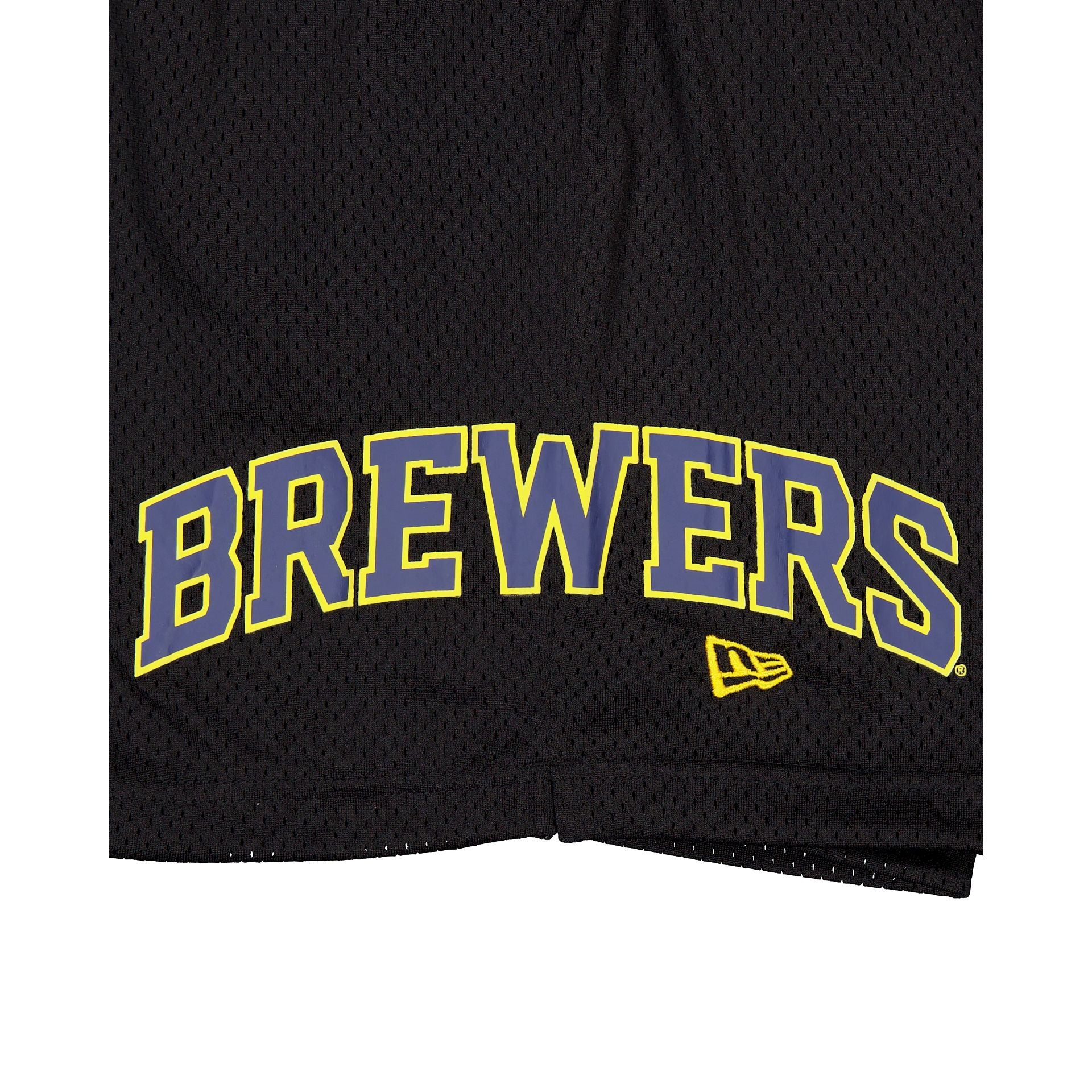 The Milwaukee Brewers Mesh Shorts features a screen-printed Brewers logo at the left leg with a team wordmark at the right leg.