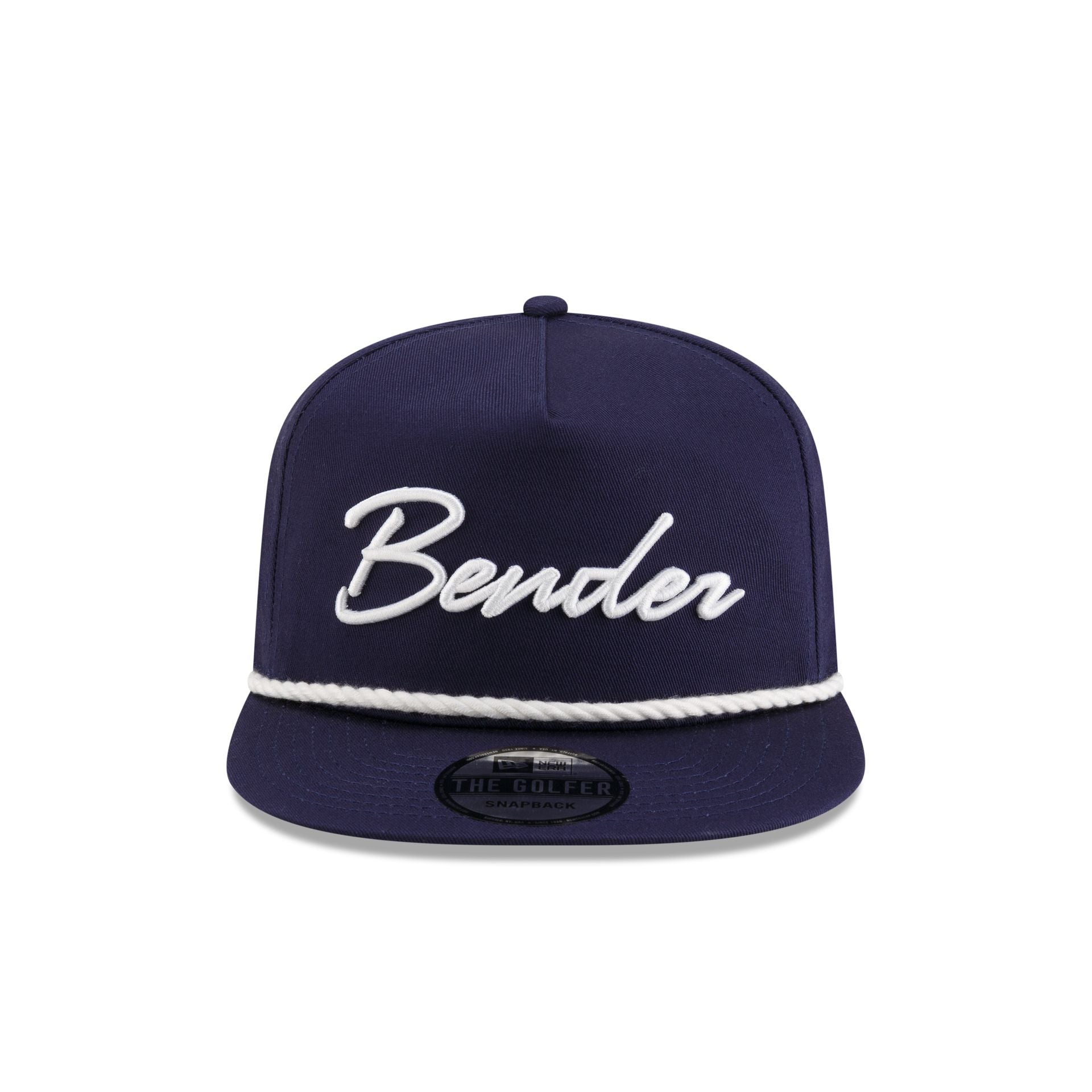 The New Era Cap Bender Golfer Hat features an embroidered Bender script at the front panels with a Buffalo patch at the right-wear side and a blue undervisor.