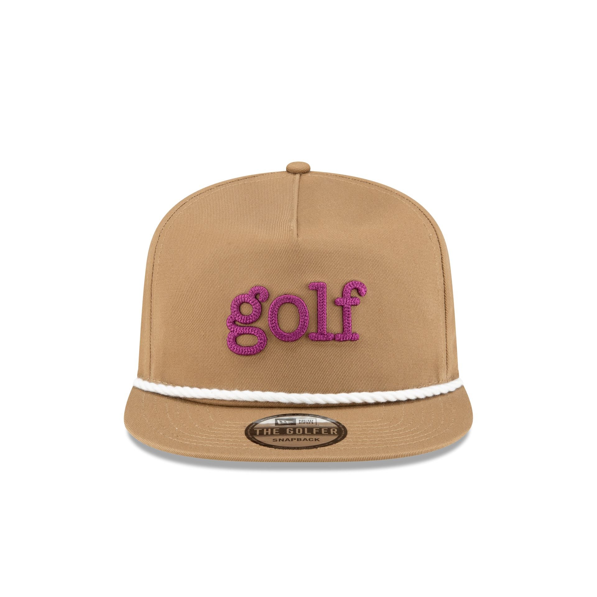The New Era Golf Tan Golfer features an embroidered golf text at the front panels with a New Era Golf logo above a snapback closure at the rear and a green undervisor.