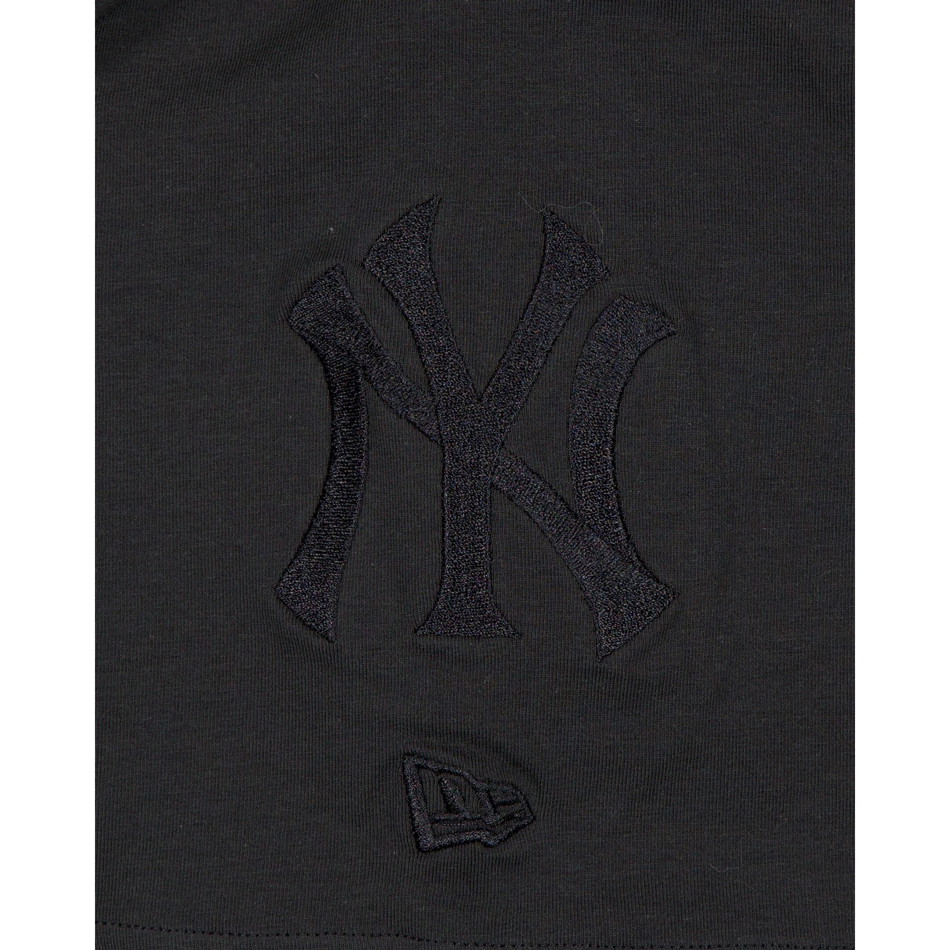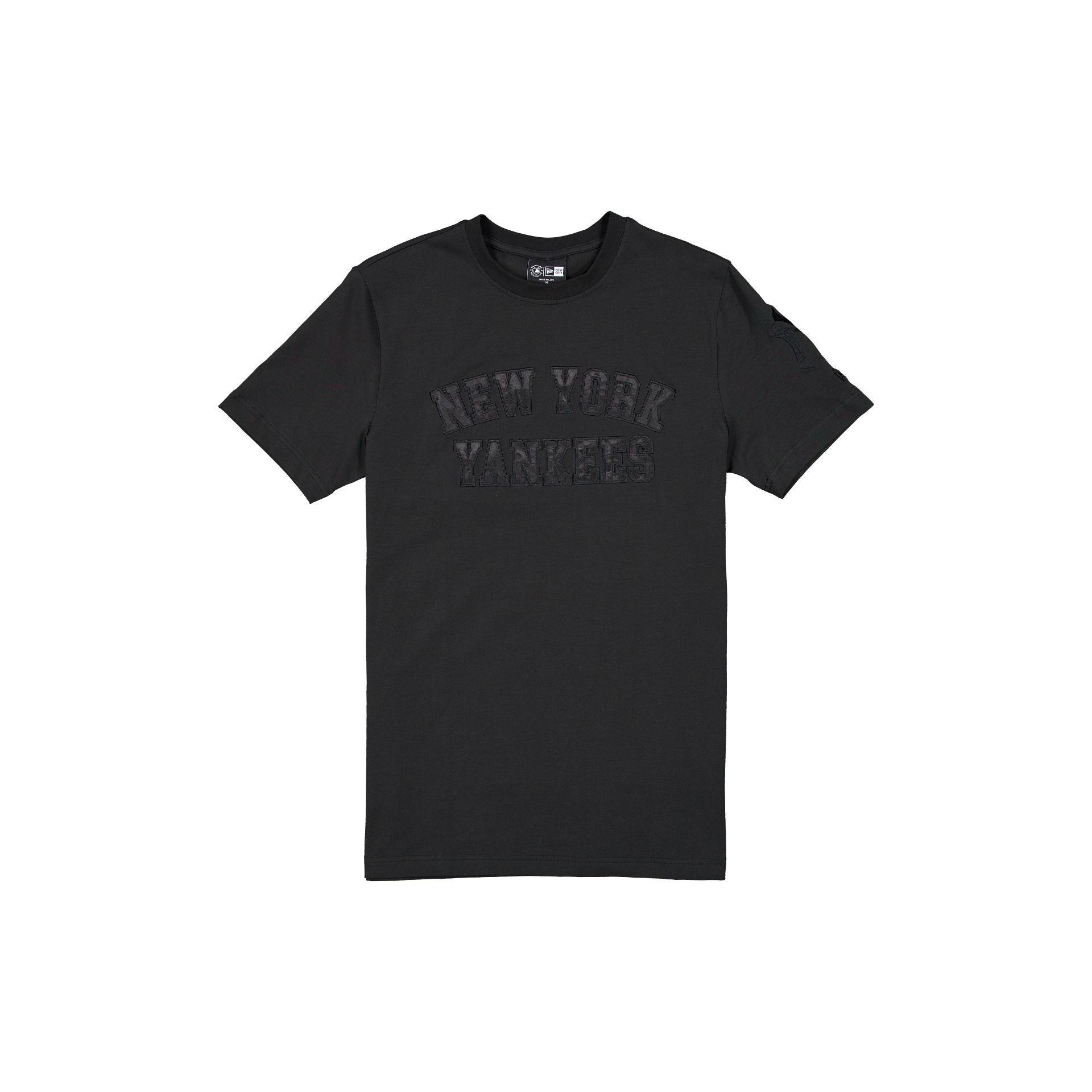 The New York Yankees Black on Black Logo Select T-Shirt features a satin applique with a tonal stitch Yankees wordmark at the chest and an embroidered team logo at the left-wear sleeve.
