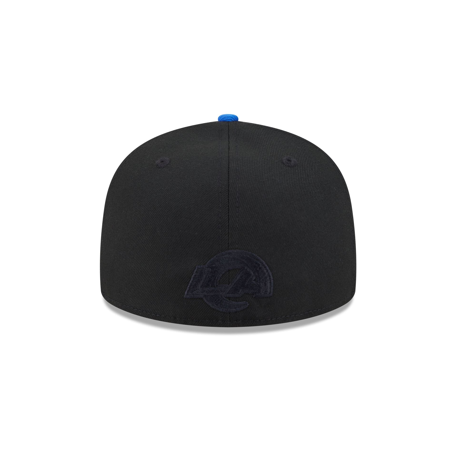 The Nickelodeon Slime x Los Angeles Rams 59FIFTY Fitted Cap features an embroidered Rams slime logo at the front panels with a monochromatic black logo at the rear and a gray undervisor.
