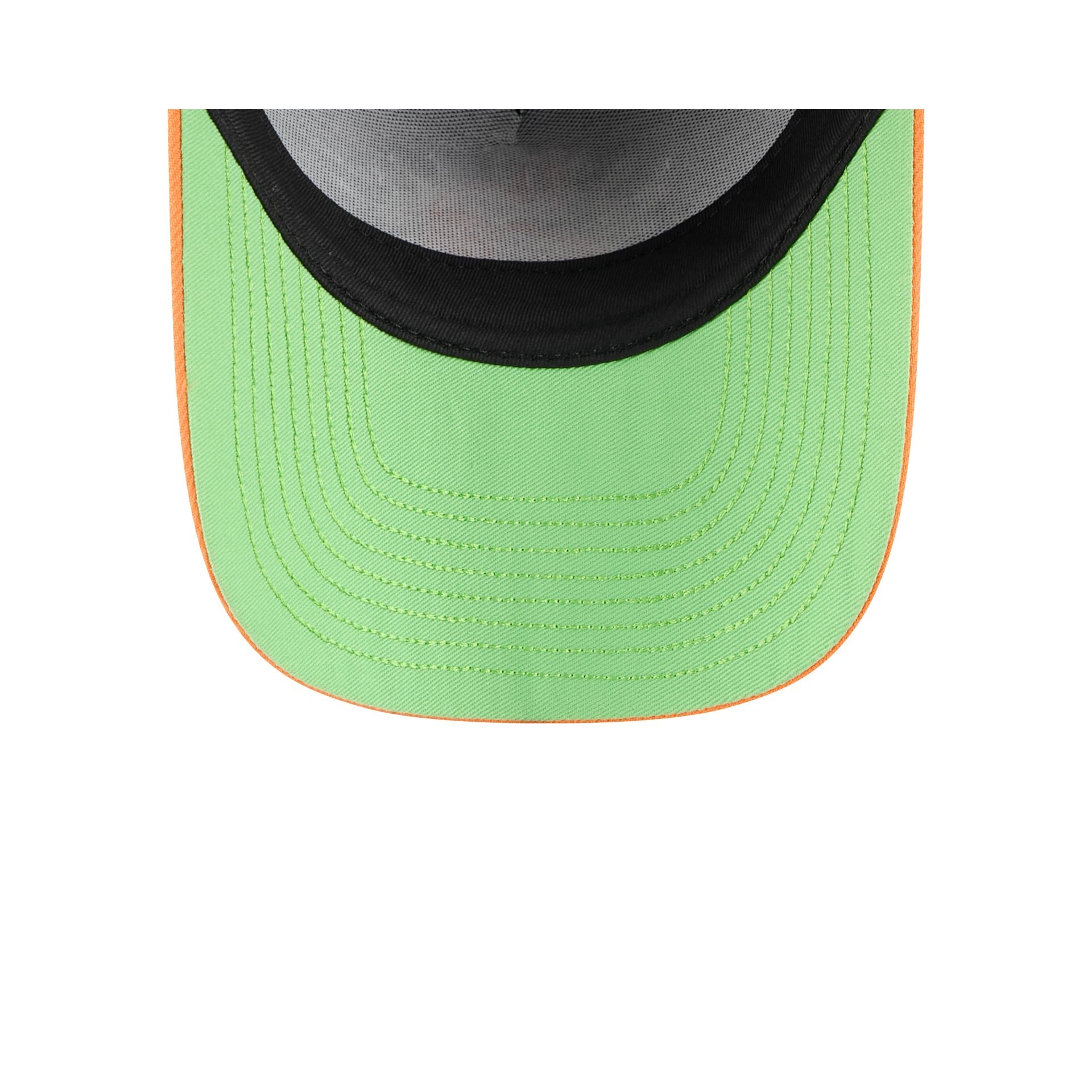 The Nickelodeon Slime x Minnesota Vikings 9FORTY A-Frame Snapback features an embroidered Vikings slime logo at the front panels with a slime splash on an orange visor. Additional details include an adjustable snapback closure at the rear and a neon green undervisor.