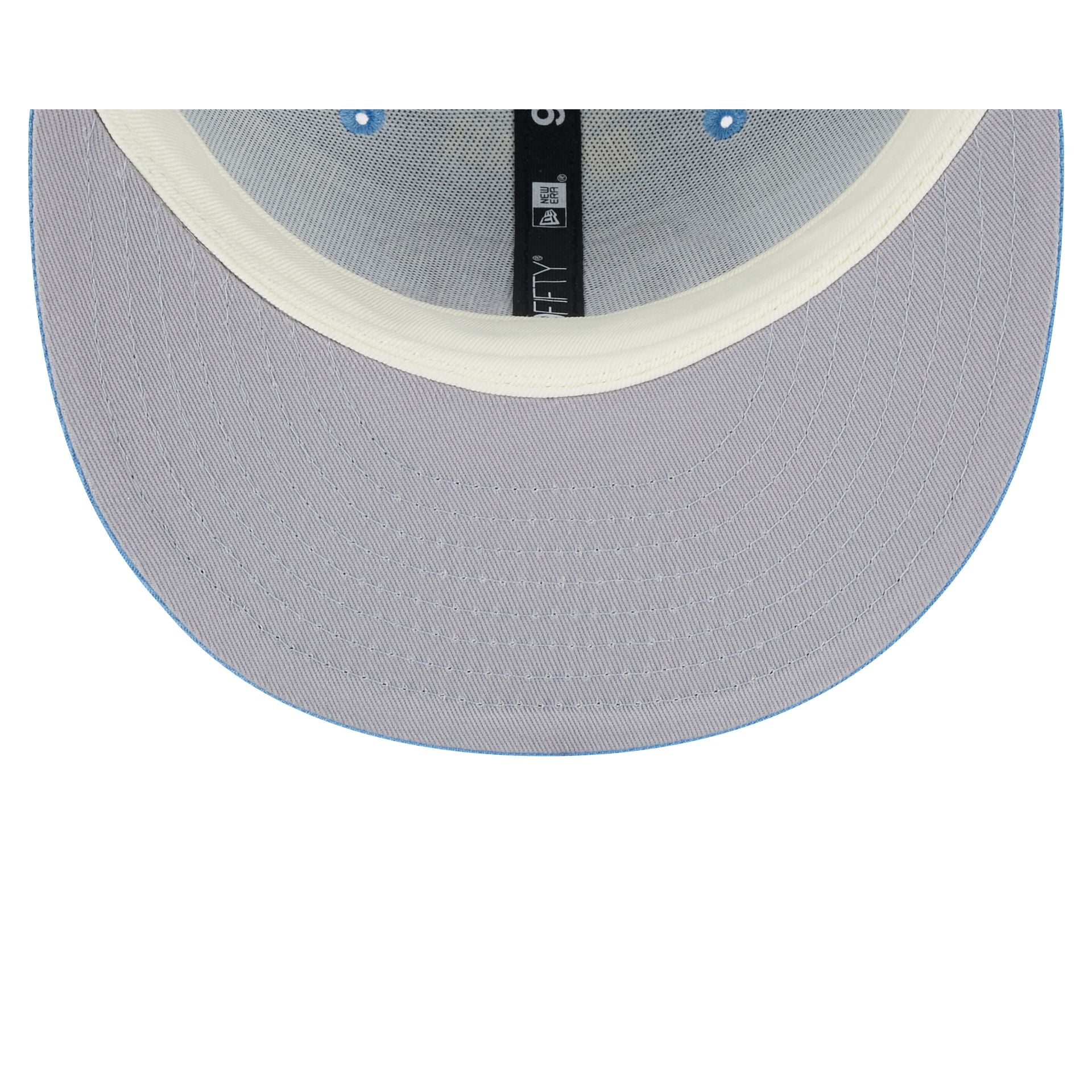 The North Carolina University Tar Heels Plaid 9FIFTY Snapback features an embroidered Tar Heels logo at the front panels against a matching plaid pattern. Additional details include a team logo above a snapback closure at the rear and a gray undervisor.
