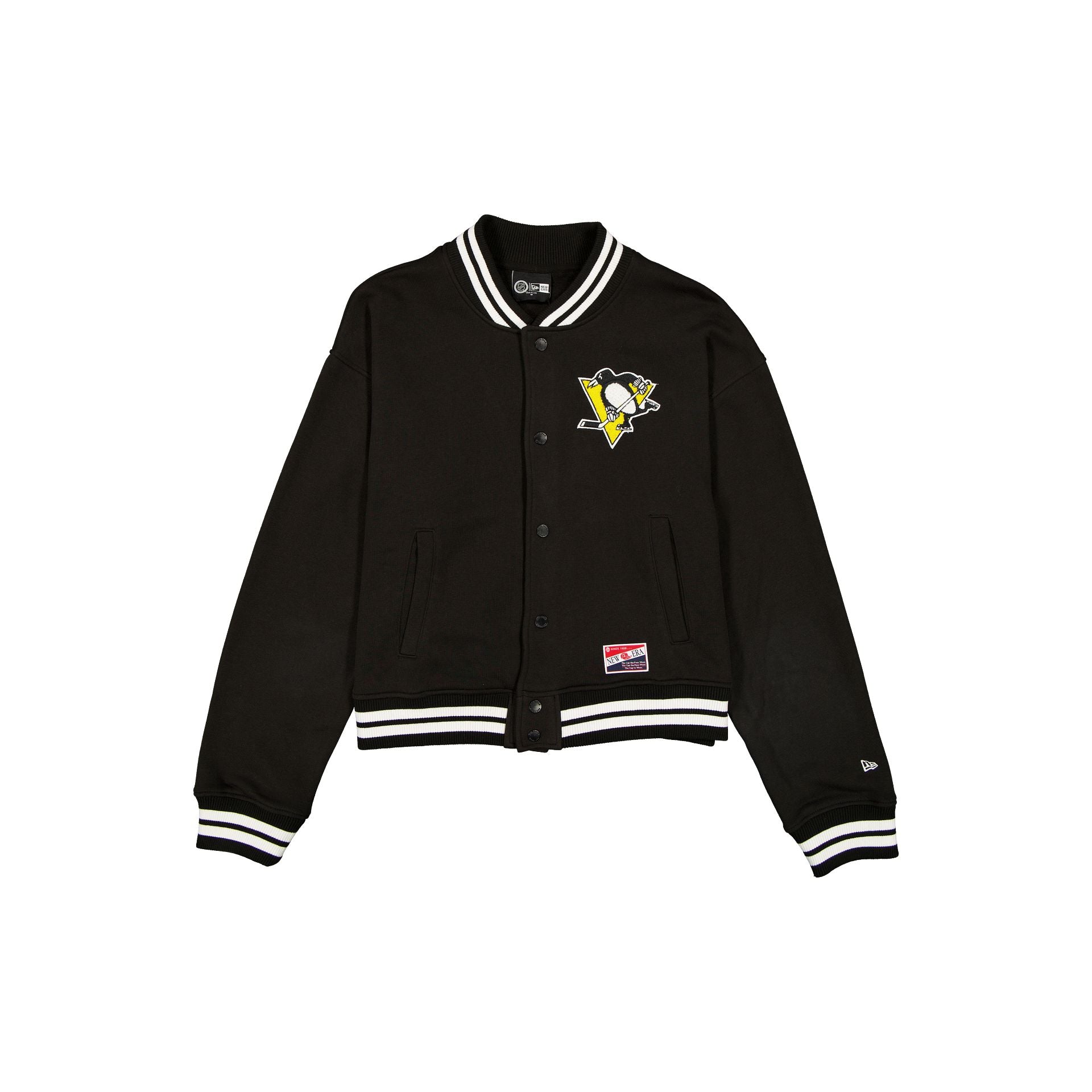 The Pittsburgh Penguins Throwback Women’s Snap Front Jacket features a chenille Penguins logo at the left chest a snap button closure and front pockets.