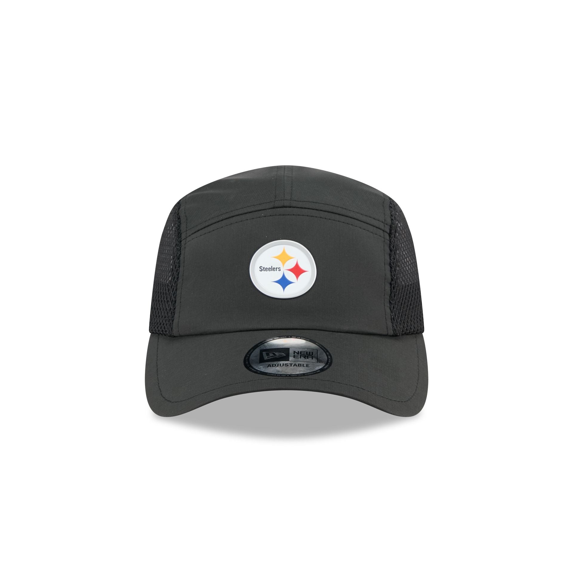The Pittsburgh Steelers Poly Runner Cap features a heat sealed Steelers logo at the front panels with mesh side panels. Additional details include a silicone patch above an adjustable drawstring closure at the rear.