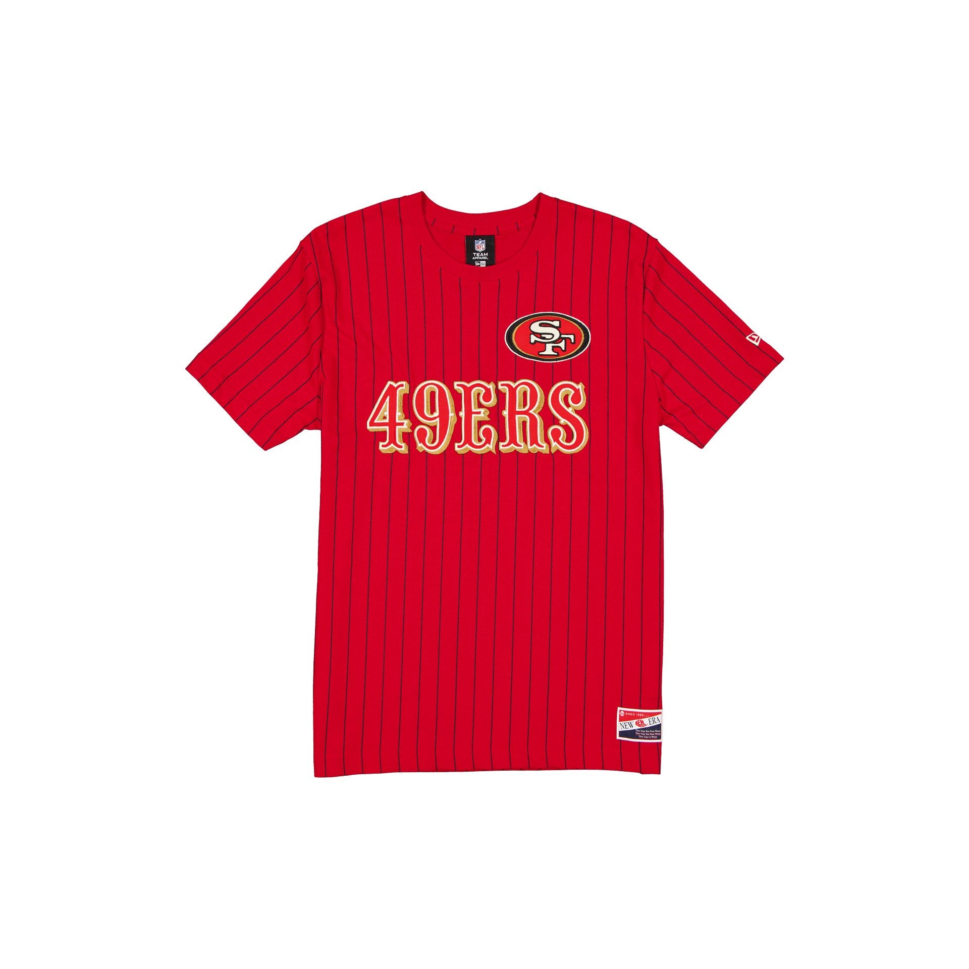 The San Francisco 49ers Throwback Retro Pinstripe T-Shirt features an embroidered 49ers wordmark at the front with a twill applique logo at the left chest.