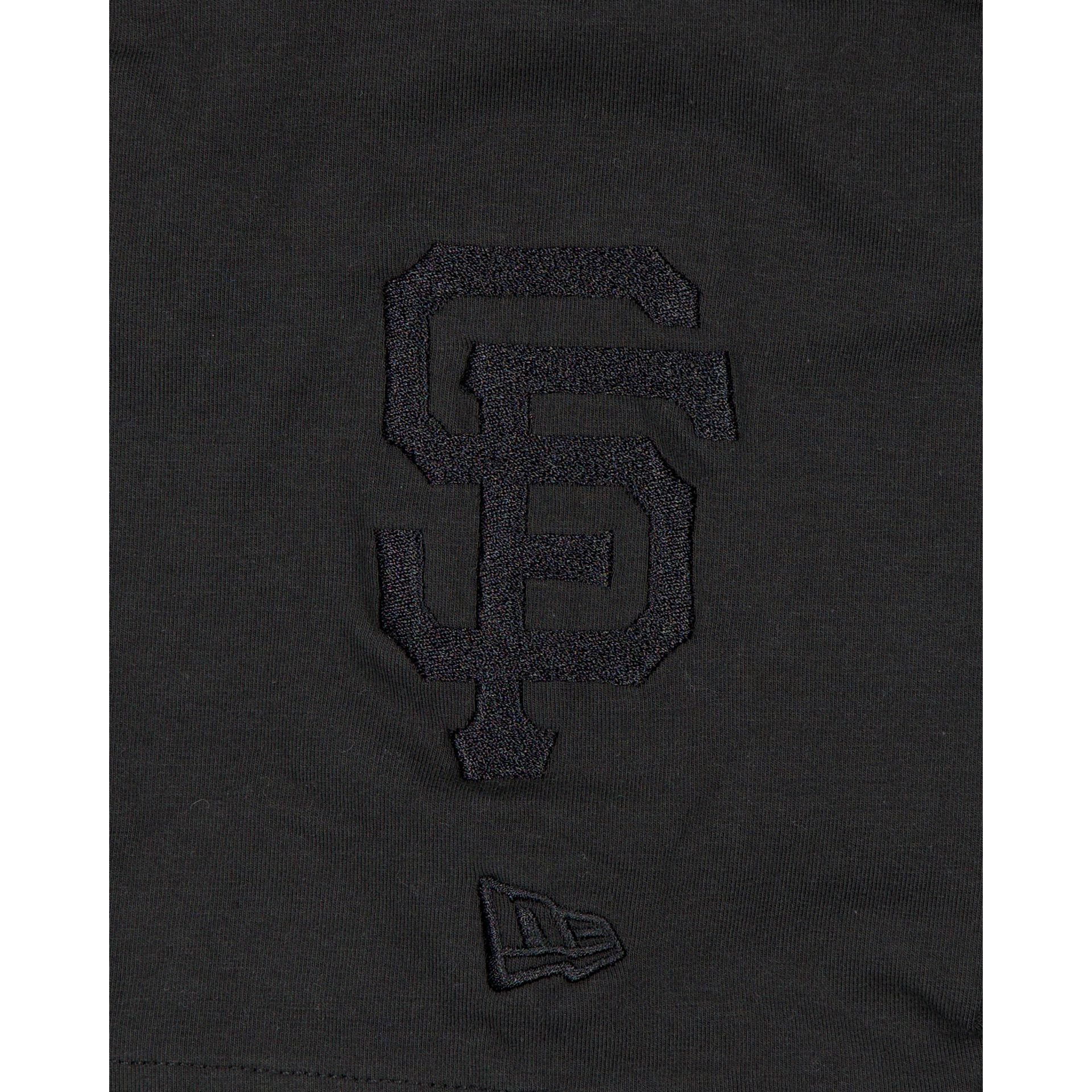 The San Francisco Giants Black on Black Logo Select T-Shirt features a satin applique with a tonal stitch Giants wordmark at the chest and an embroidered team logo at the left-wear sleeve.