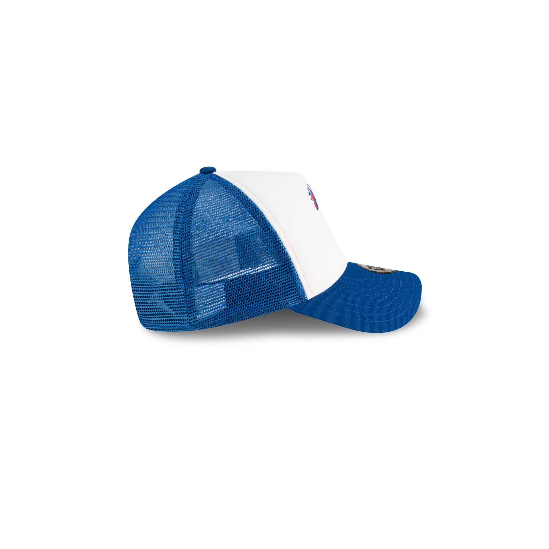 The Superman Kids Blue 9FORTY A-Frame Trucker features a screen-printed Superman graphic at the front panels against a plush fabrication. Additional details include a mesh back and a snapback closure at the rear.