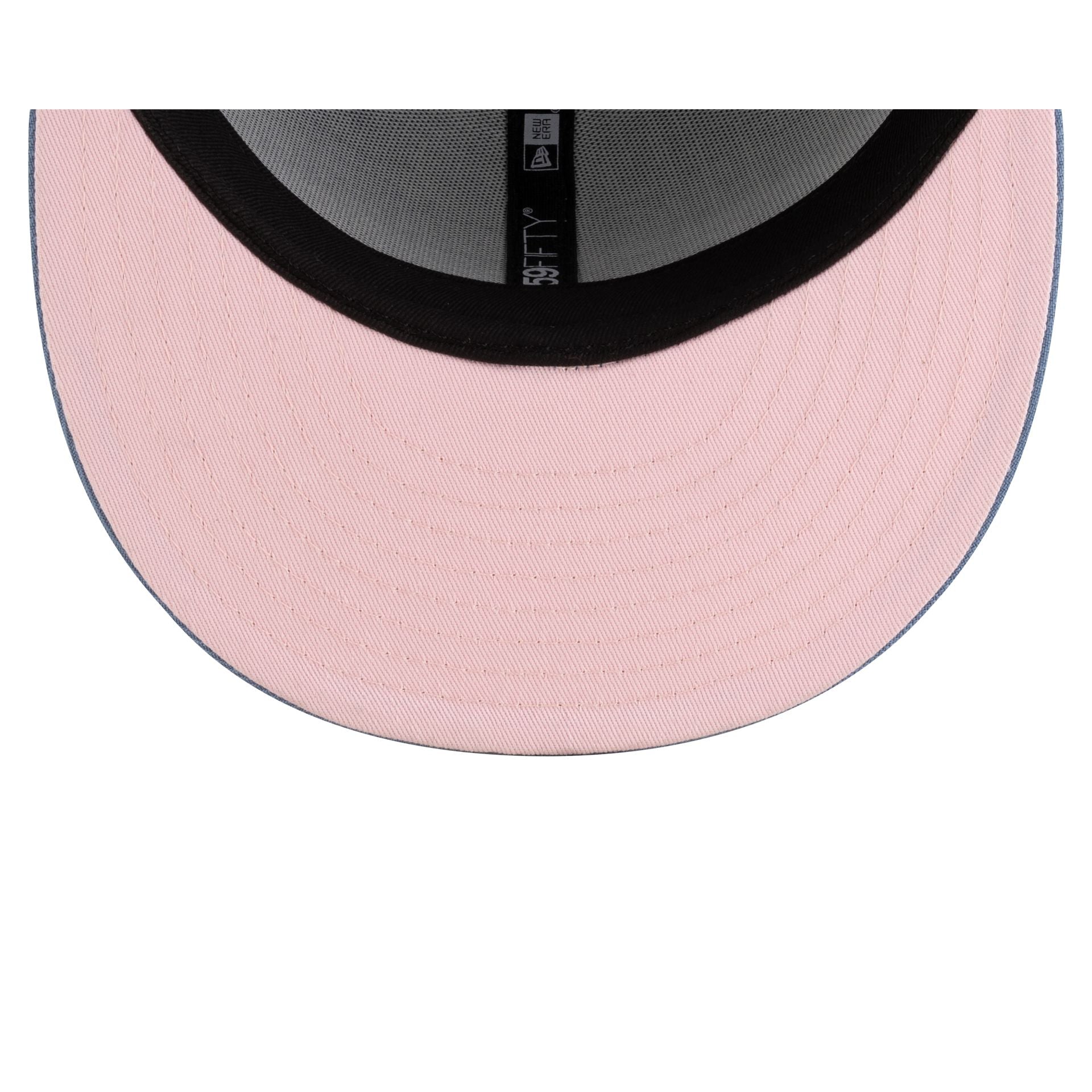 The Tyler Herro x Milwaukee Brewers Distressed Denim 59FIFTY Fitted Cap features an embroidered Brewers logo at the front panels with a distressed denim fabrication throughout. Additional details include a matching baseball at the rear and a pink undervisor.