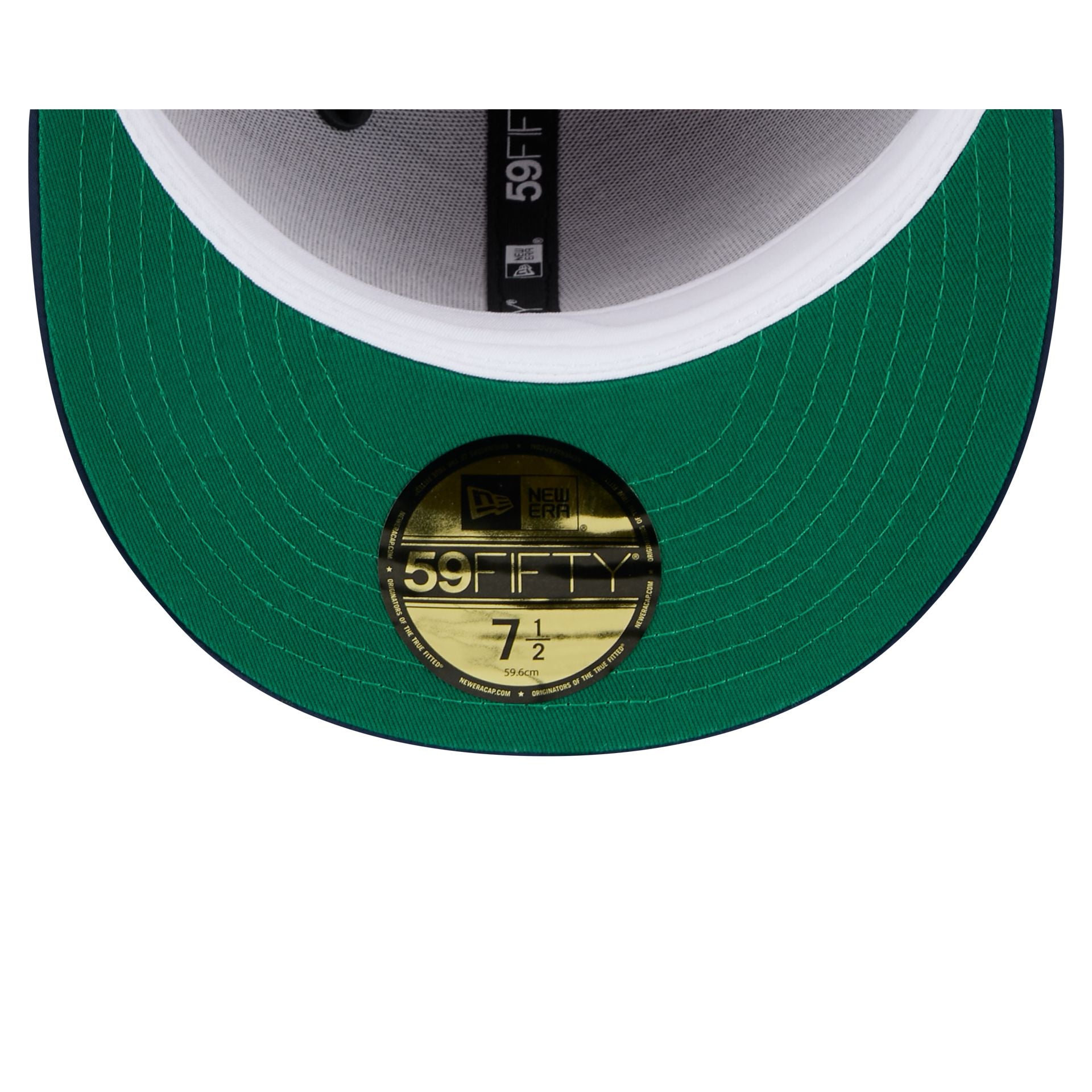 The Washington Capitals Spring Satin 59FIFTY Fitted Cap features an embroidered Capitals wordmark at the front panels with a New Era pin at the top left panel and an NHL Shield logo at the rear. Additional details include a satin fabrication throughout. a logo at the right-wear side. and a green undervisor.