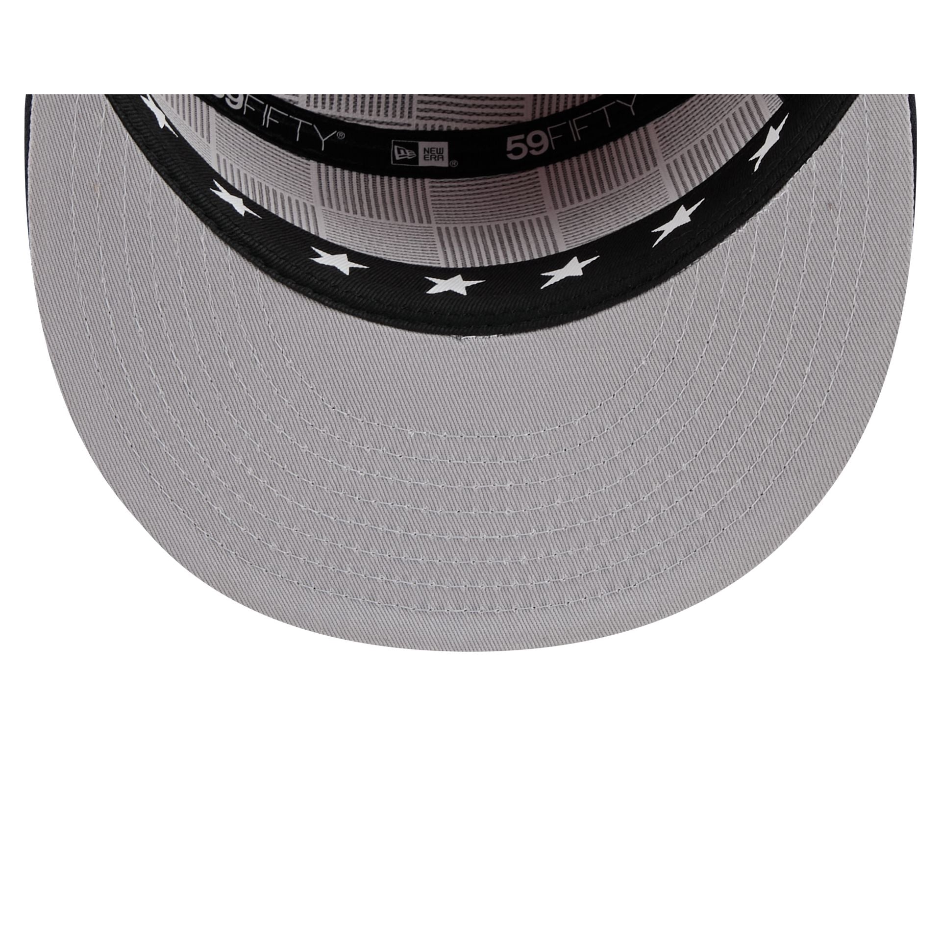 The Washington Nationals 2025 All-Star Game Split Panel 59FIFTY Fitted Cap features an embroidered Nationals logo at the front panels against a split-crown construction with breathable mesh fabric at the side and rear panels. Additional details include stars at the top panel. a 2025 All-Star Game patch at the right-wear side. the MLB Batterman logo at the rear. and a gray undervisor. The cap also features screen-printed stars on the sweatband.